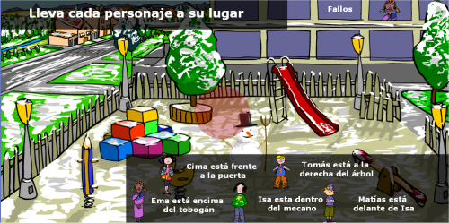 Se permite colocar a los personajes en lugares incorrectos. Cuando se colocan todos, aparece un botón de comprobación de resultados. Si hay fallos, se cuenta y se deben de recolocar las veces que sean necesarias, hasta conseguir realizar la actividad con éxito. Entonces se permitirá pasar a la siguiente actividad y acceder a la pantalla de evaluación.