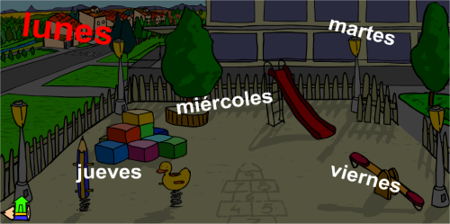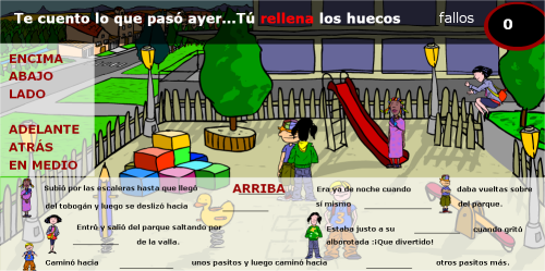 Se muestra el parque con los niños en plena actividad lúdica. En la parte inferior de la pantalla se puede leer  una crónica incompleta de lo que sucedió ese día. Haciendo clic encima del icono de cada personaje, el locutor nos narra de forma incompleta que hacía cada personaje. Las palabras que faltan para completar los sucesos están disponibles en la parte izquierda de la pantalla. Haciendo clic y arrastrándolas, se deben colocar encima de las líneas que inicialmente ocupan sus posiciones. Así se completan las frases.