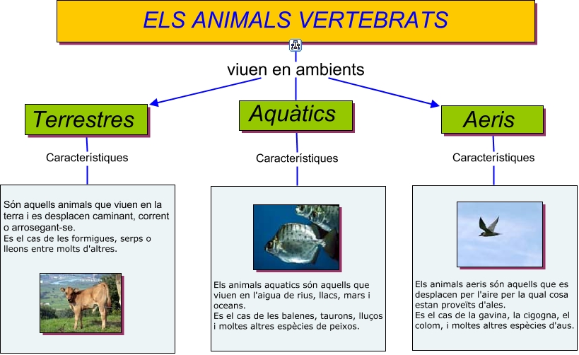 ambients, Aeris Característiques Els animals aeris són aquells que es desplacen per l'aire per la qual cosa estan proveïts d'ales. Es el cas de la gavina, la cigogna, el colom, i moltes altres espècies d'aus., Aquàtics Característiques Els animals aquatics són aquells que viuen en l'aigua de rius, llacs, mars i oceans. Es el cas de les balenes, taurons, lluços i moltes altres espècies de peixos., ELS ANIMALS VERTEBRATS viuen en ambients Aeris, Terrestres Característiques Són aquells animals que viuen en la terra i es desplacen caminant, corrent o arrosegant-se. Es el cas de les formigues, serps o lleons entre molts d'altres., ELS ANIMALS VERTEBRATS viuen en ambients Aquàtics, ELS ANIMALS VERTEBRATS viuen en ambients Terrestres