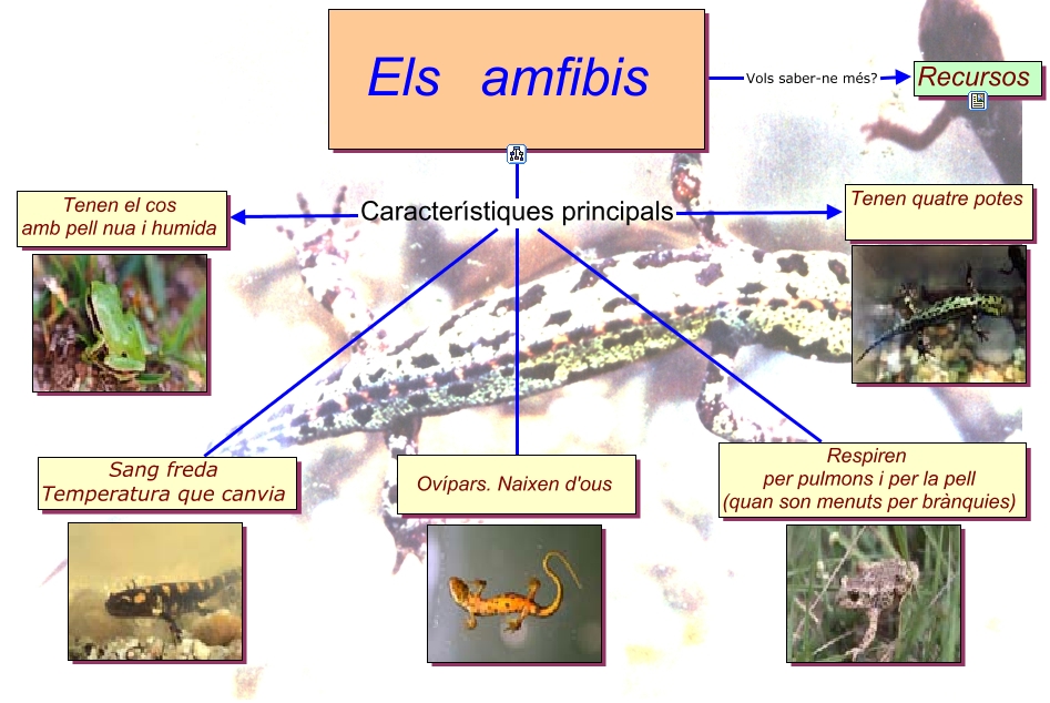 amfibis, Els amfibis Característiques principals Tenen el cos amb pell nua i humida, Els amfibis Característiques principals Respiren per pulmons i per la pell (quan son menuts per brànquies), Els amfibis Característiques principals Tenen quatre potes, Els amfibis Característiques principals Sang freda Temperatura que canvia, Els amfibis Característiques principals Ovípars. Naixen d'ous, Els amfibis Vols saber-ne més? Recursos