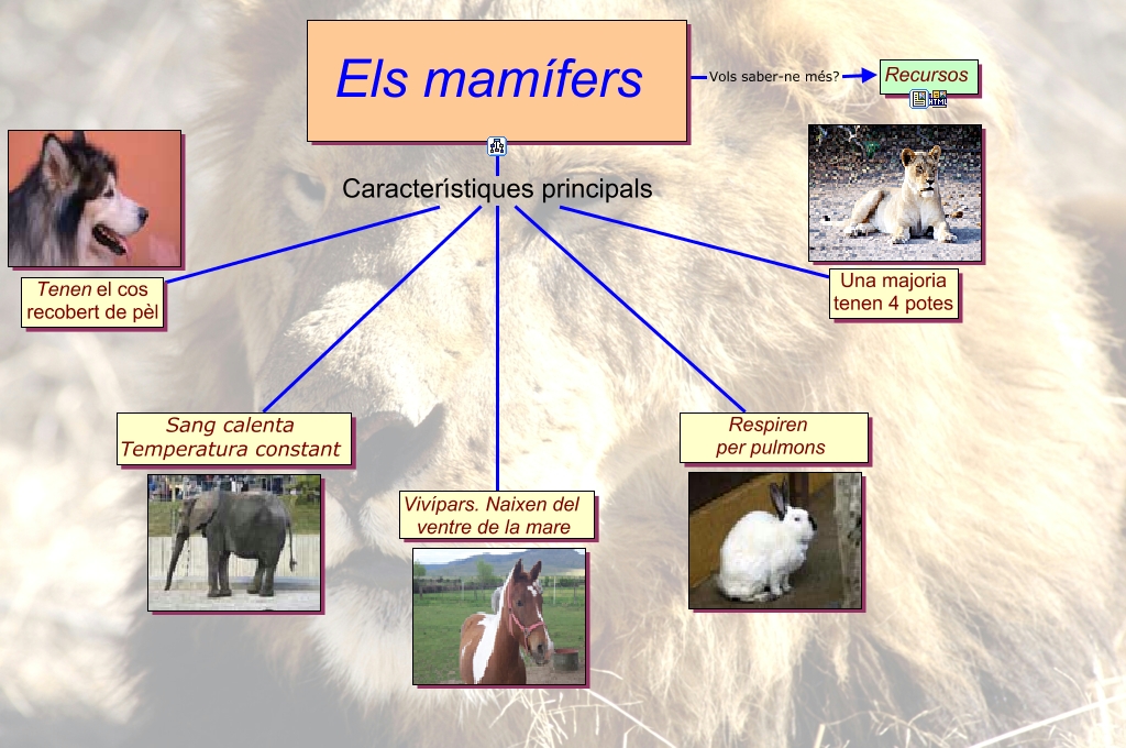 mamifers, Els mamífers Característiques principals Tenenel cos recobert de pèl, Els mamífers Característiques principals Una majoria tenen 4 potes, Els mamífers Característiques principals Respiren per pulmons, Els mamífers Característiques principals Vivípars. Naixen del ventre de la mare, Els mamífers Característiques principals Sang calenta Temperatura constant, Els mamífers Vols saber-ne més? Recursos