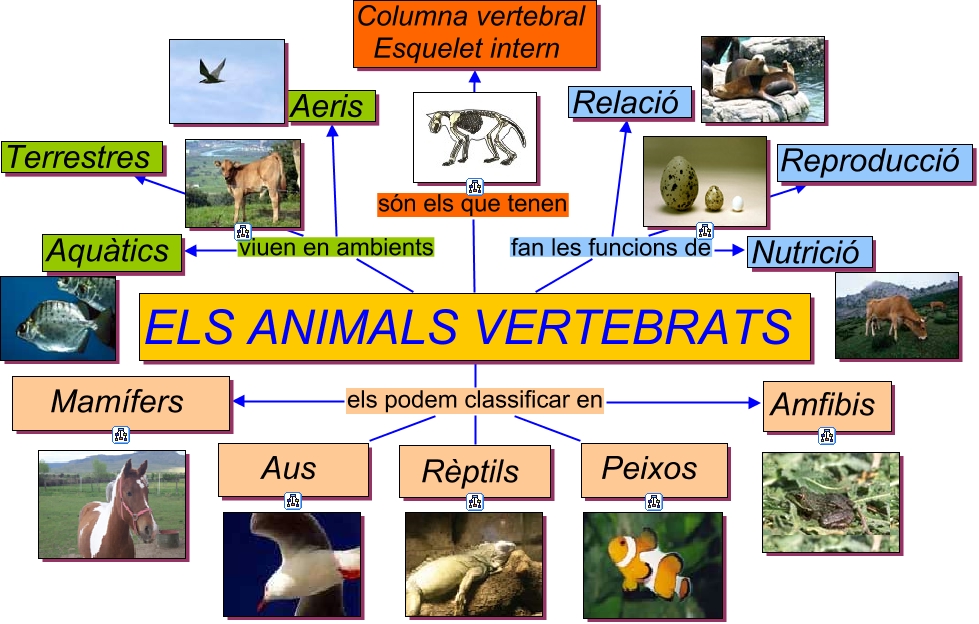 els essers vius, ELS ANIMALS VERTEBRATS els podem classificar en Amfibis, ELS ANIMALS VERTEBRATS els podem classificar en Rèptils, ELS ANIMALS VERTEBRATS fan les funcions de Reproducció, ELS ANIMALS VERTEBRATS els podem classificar en Aus, ELS ANIMALS VERTEBRATS viuen en ambients Aquàtics, ELS ANIMALS VERTEBRATS fan les funcions de Nutrició, ELS ANIMALS VERTEBRATS viuen en ambients Terrestres, ELS ANIMALS VERTEBRATS els podem classificar en Mamífers, ELS ANIMALS VERTEBRATS són els que tenen Columna vertebral Esquelet intern, ELS ANIMALS VERTEBRATS els podem classificar en Peixos