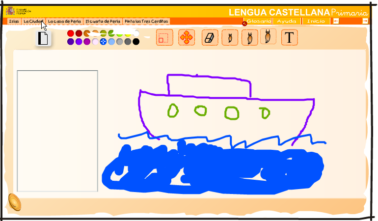 Se trata de construir un cuento ilustrado, con viñetas a partir de elementos dados: personajes en distintas posiciones, escenarios y espacio para la narración de cada viñeta. De este modo el usuario trabajará sobre una ventana, con recursos de personajes, objetos y escenarios a un lado, a modo de barra de utilidades, y con un espacio para texto, en la parte inferior.
