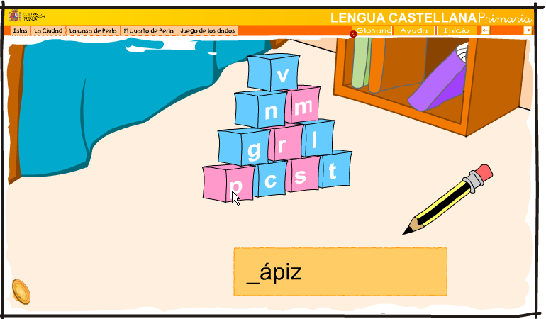 El ejercicio tiene cuatro niveles de dificultad. El niño o la niña deberá completar palabras seleccionando letras de la pirámide, el dado se colocará en la parte inferior izquierda de la pantalla.